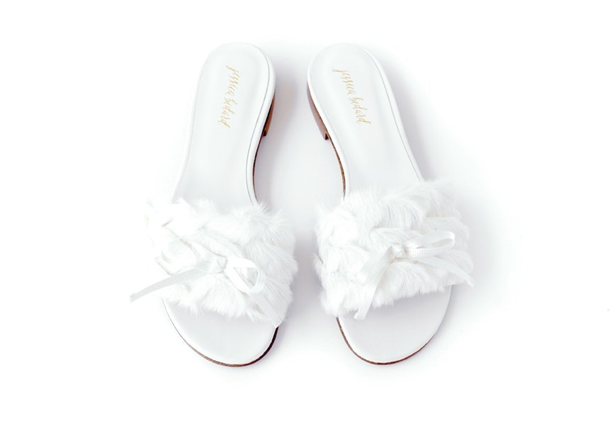 The ADELINE Fur Slide Sandal takes brides from day to night. It is a perfectly comfortable selection to wear as they are getting ready and to slip into for the reception.
