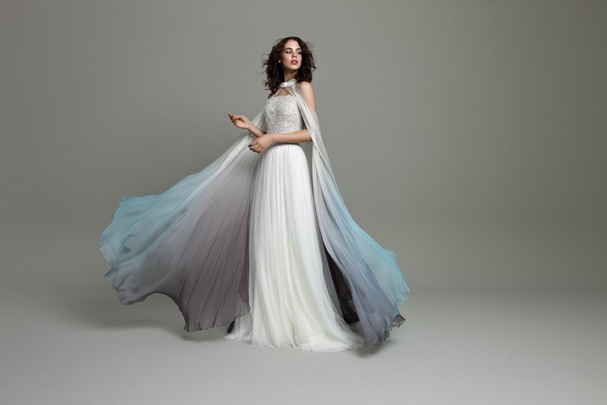 A combination of the collar and cape trends, this dress by DAALARNA makes a statement. It also covers a bride’s “something blue” requirement for her walk down the aisle.