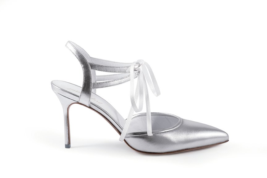 The classic ELLE Ankle Tie Pump represents all of Jessica Bedard’s trend predictions for 2019. Its closed, pointed toe and satin finish in the perfect wedding neutral: silver.